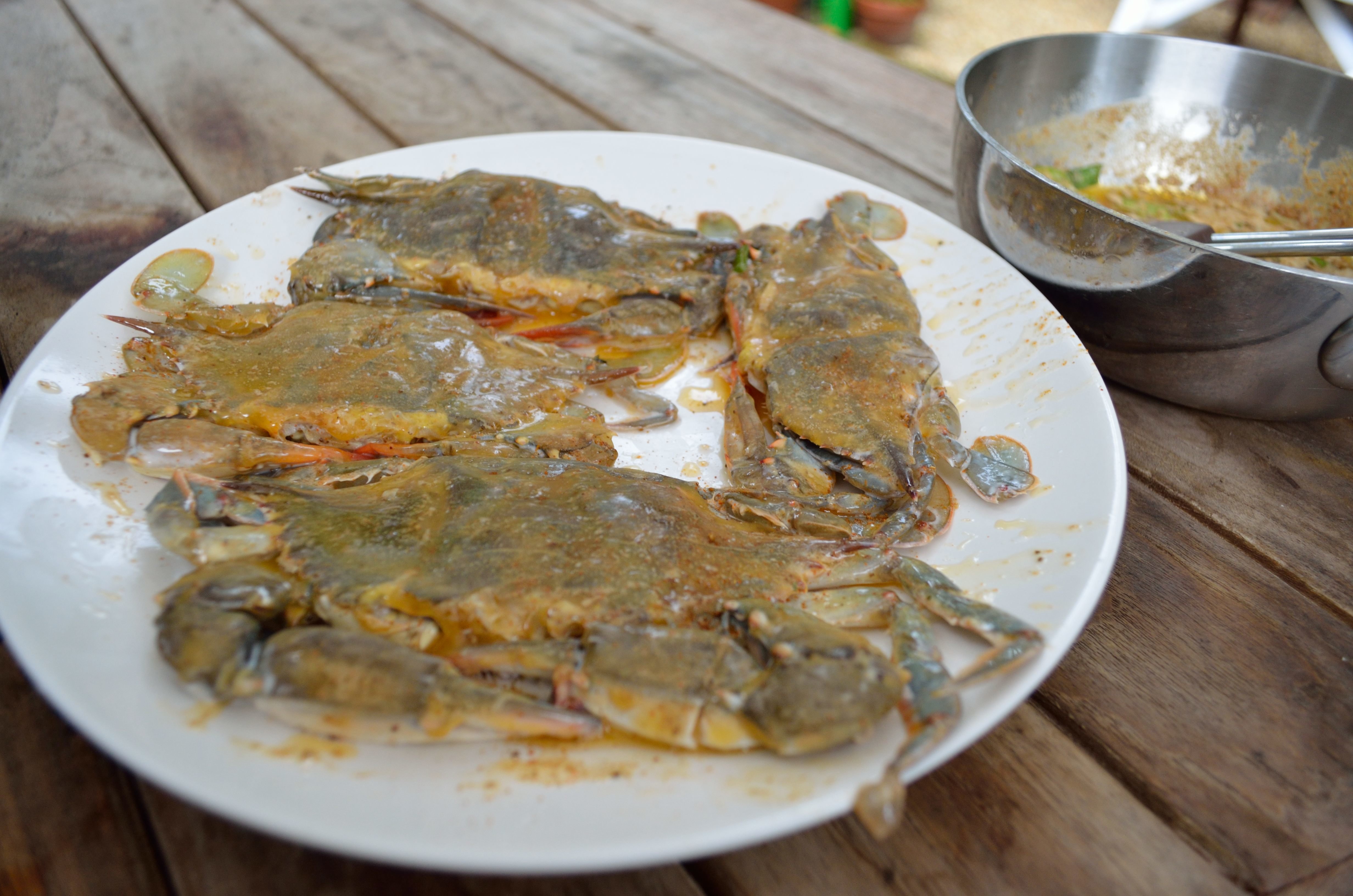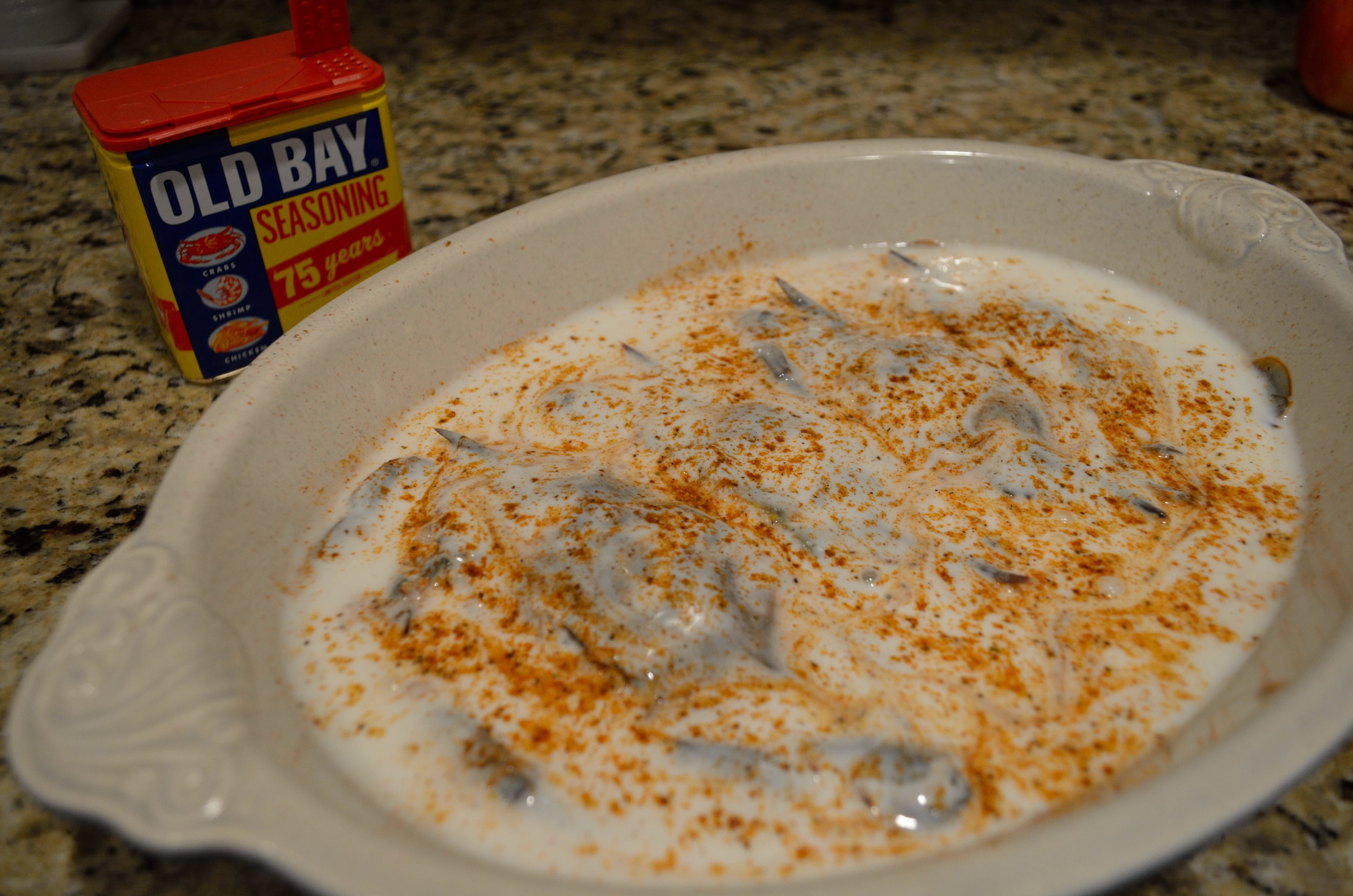 Generously season the crabs with Old Bay and then cover with buttermilk. Add another sprinkle of Old Bay on top and let them rest in the fridge for 30-60 minutes.