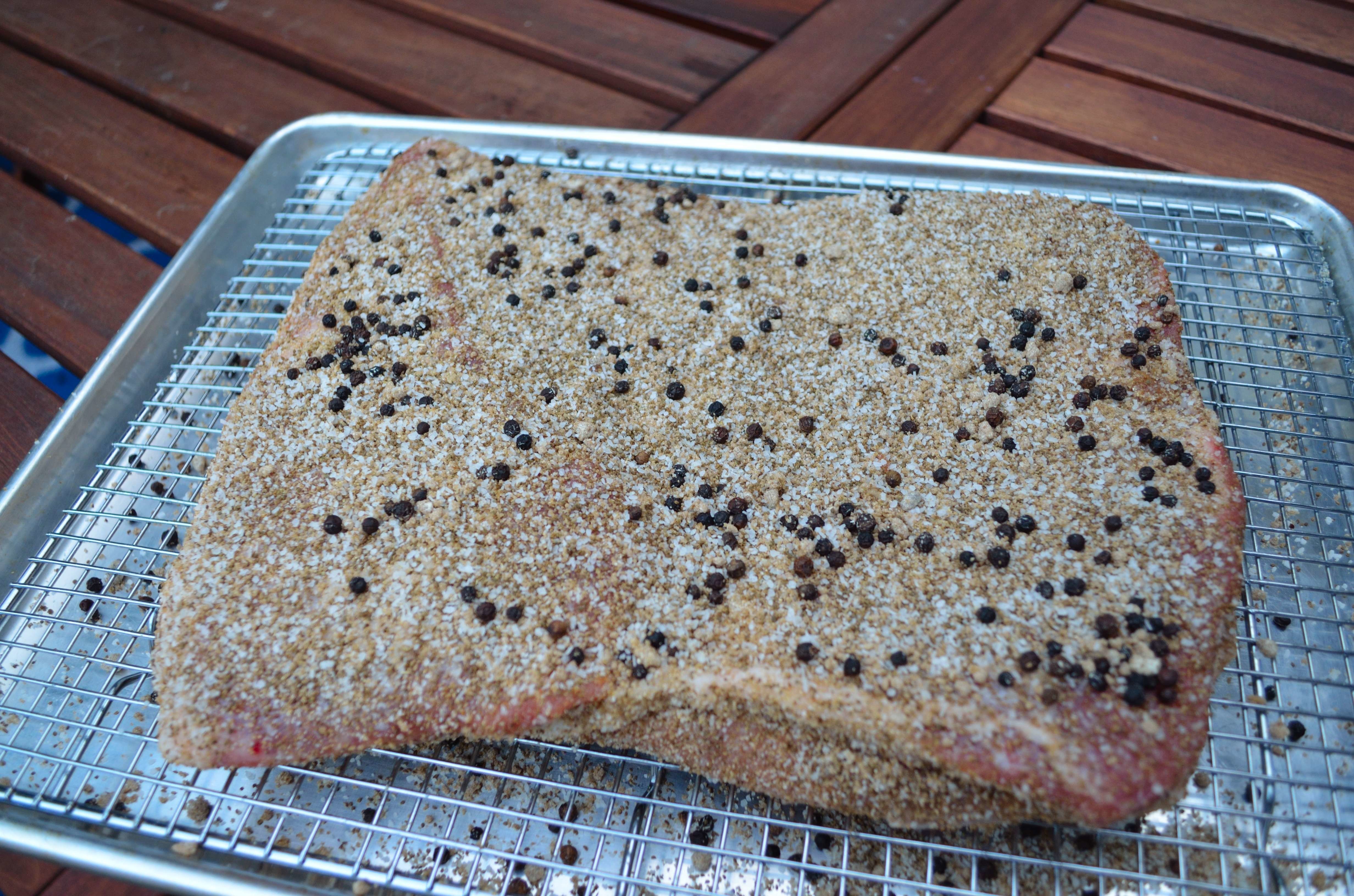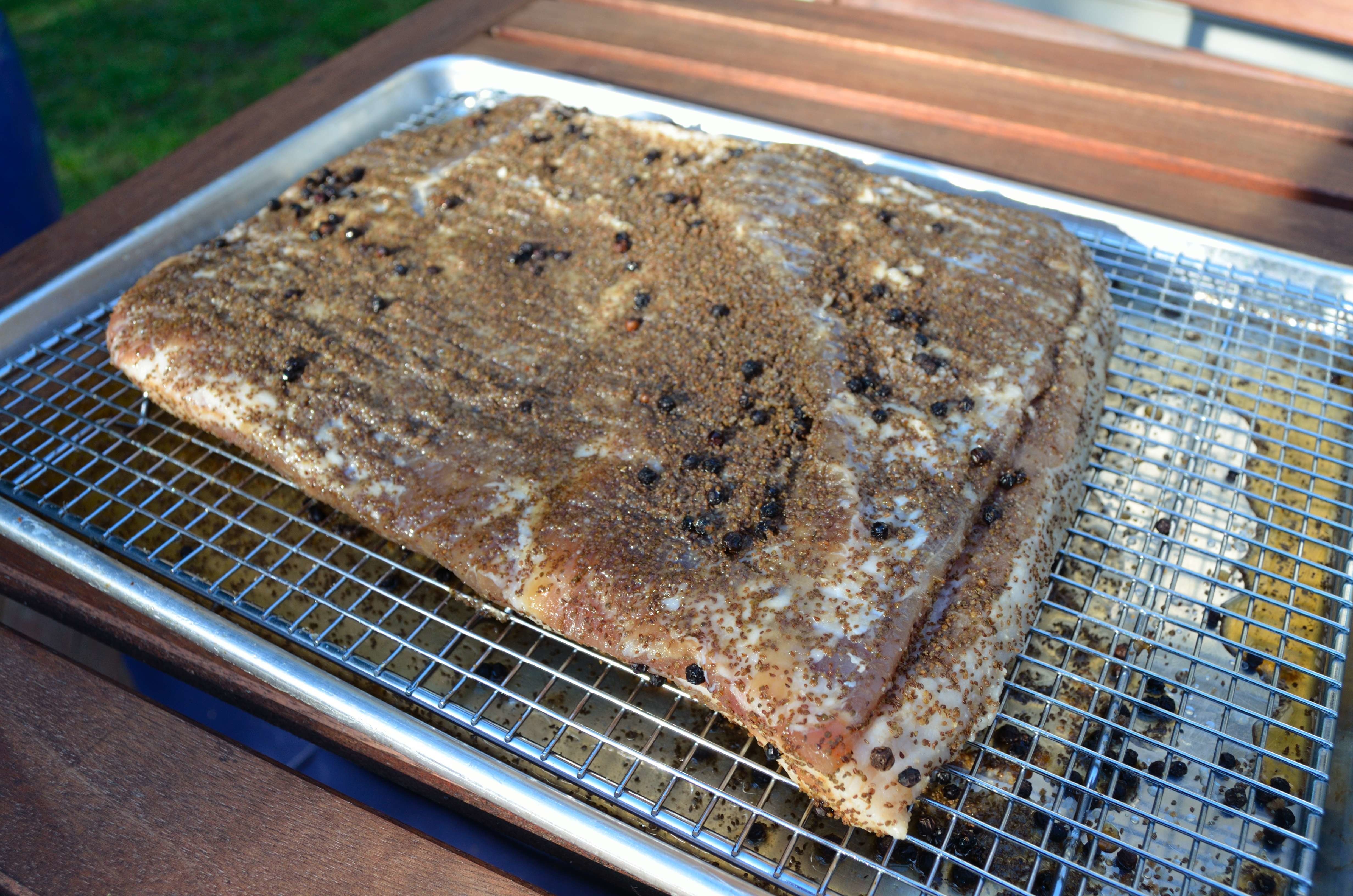 Coat the pork belly heavily on all sides with your bacon cure and place on a rack in a sheet pan. You can get very creative with the flavors in your cure to create uniquely awesome bacon. Using pink salt (sodium nitrate) is also optional if you plan on eating your bacon within a few weeks. You can opt to use celery seeds which have a high level of naturally occurring nitrates to help with the curing process. Here is the bacon cure we used: