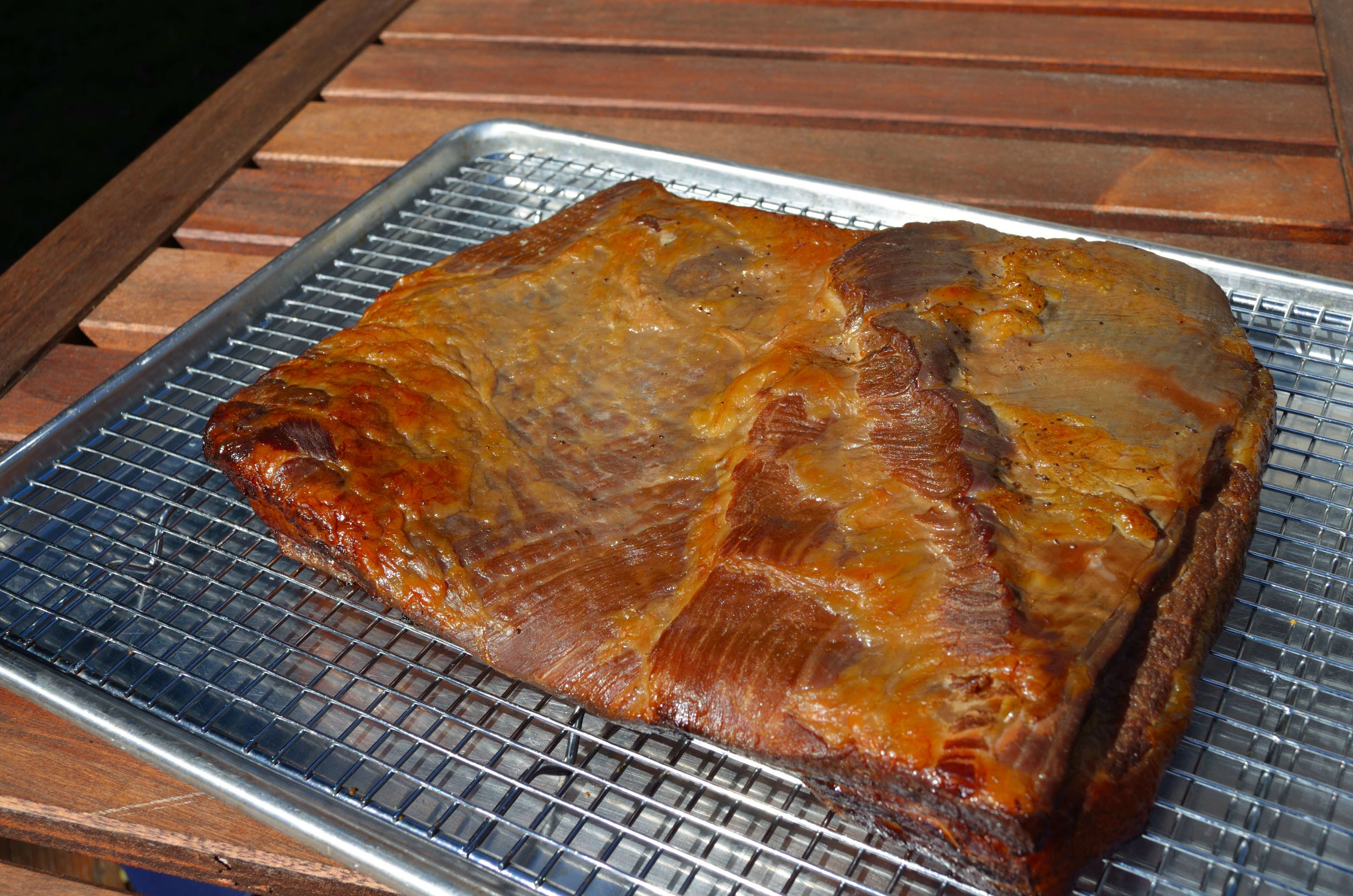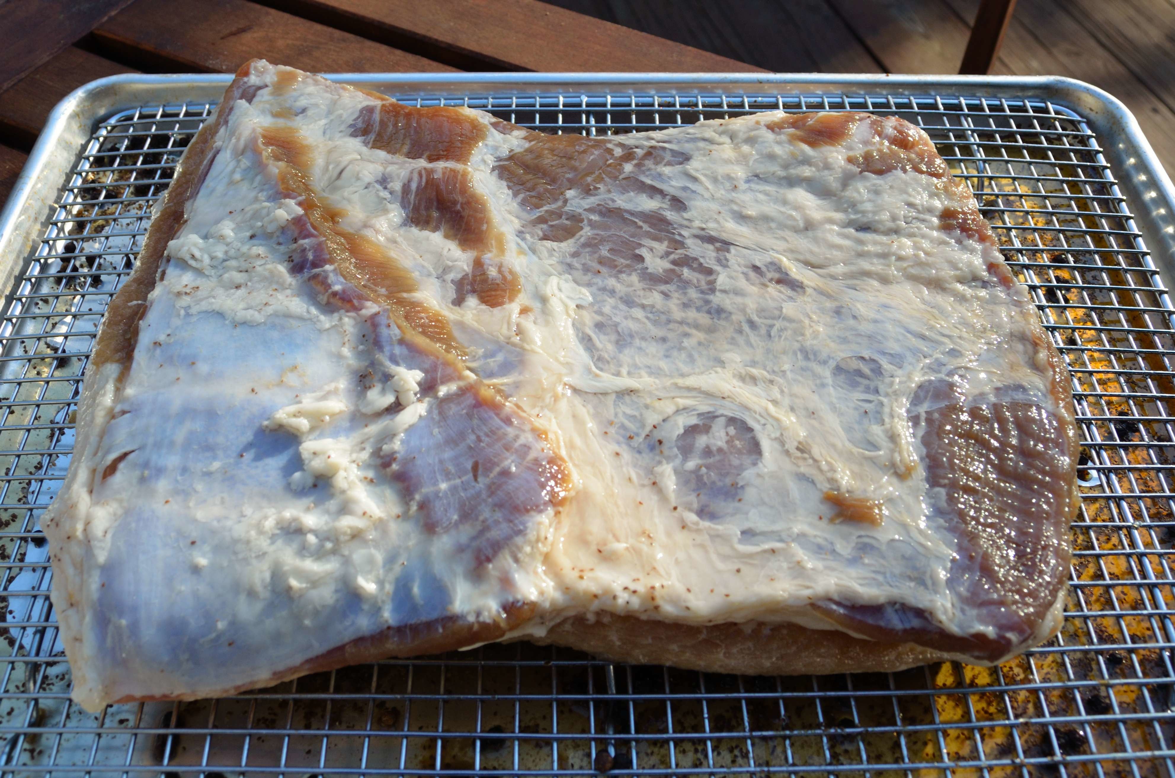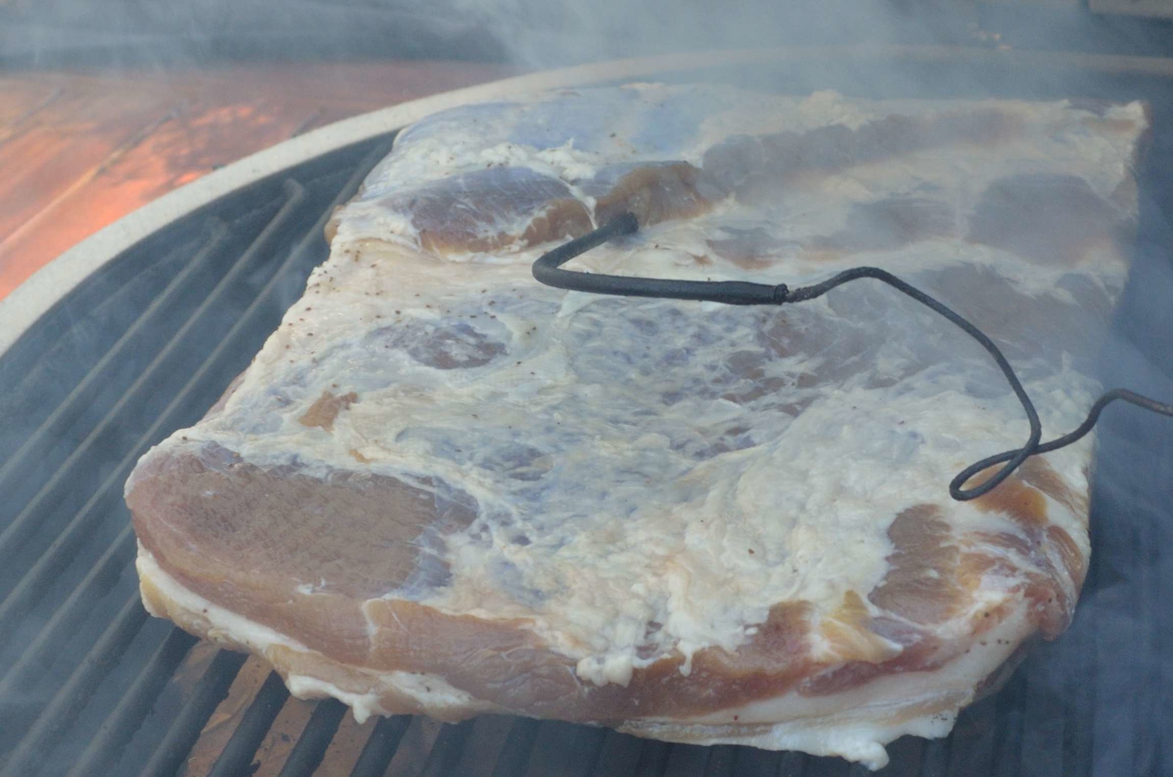 Rinse the belly repeatedly to wash off the cure and then soak it in cold water. At this point prepare the Primo for smoking and soak a few cups of apple and hickory chips.