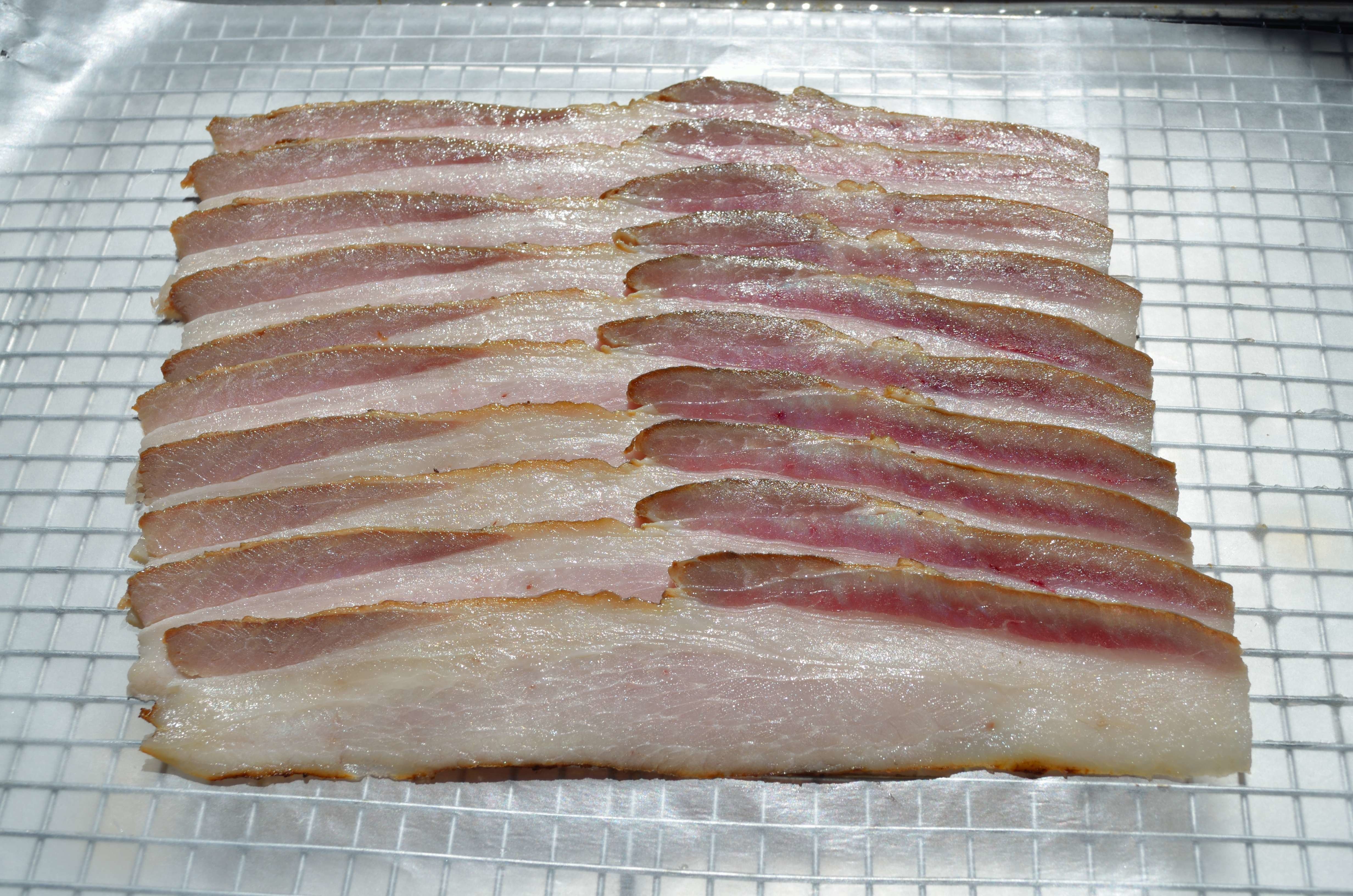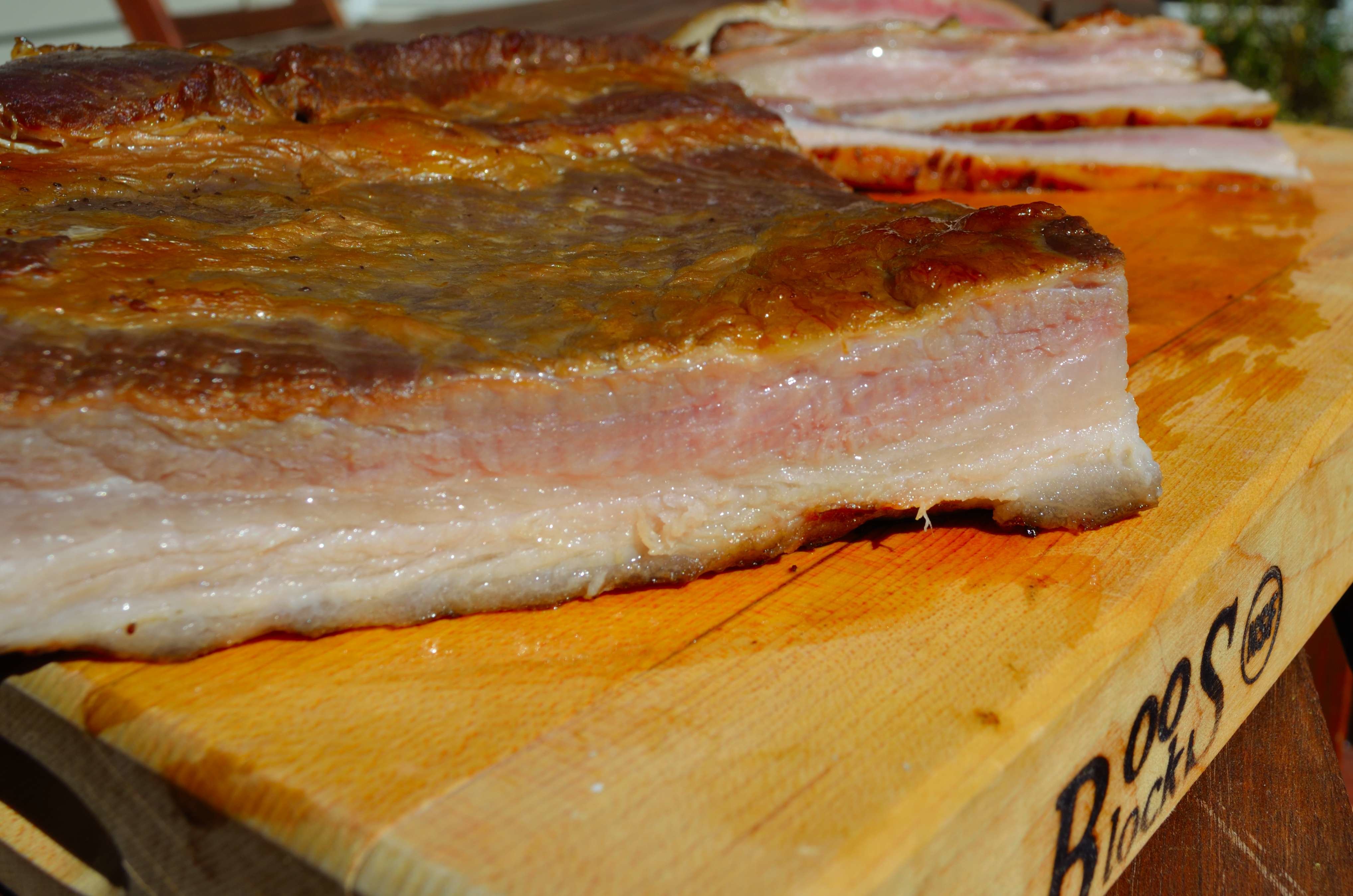If you are inclined don’t shut down the Primo- increase the heat (ok to leave in the d plates) and pre-heat your favorite cast iron pan or Primo Cast Iron Griddle. Hand slice some thick pieces around the edges to square up (rectangle) the slab of bacon. Put it in the fridge to cool- once it cools it will be much easier to slice the bacon, especially if you are using a meat slicer. Of course you’ll want to cook the edge pieces…