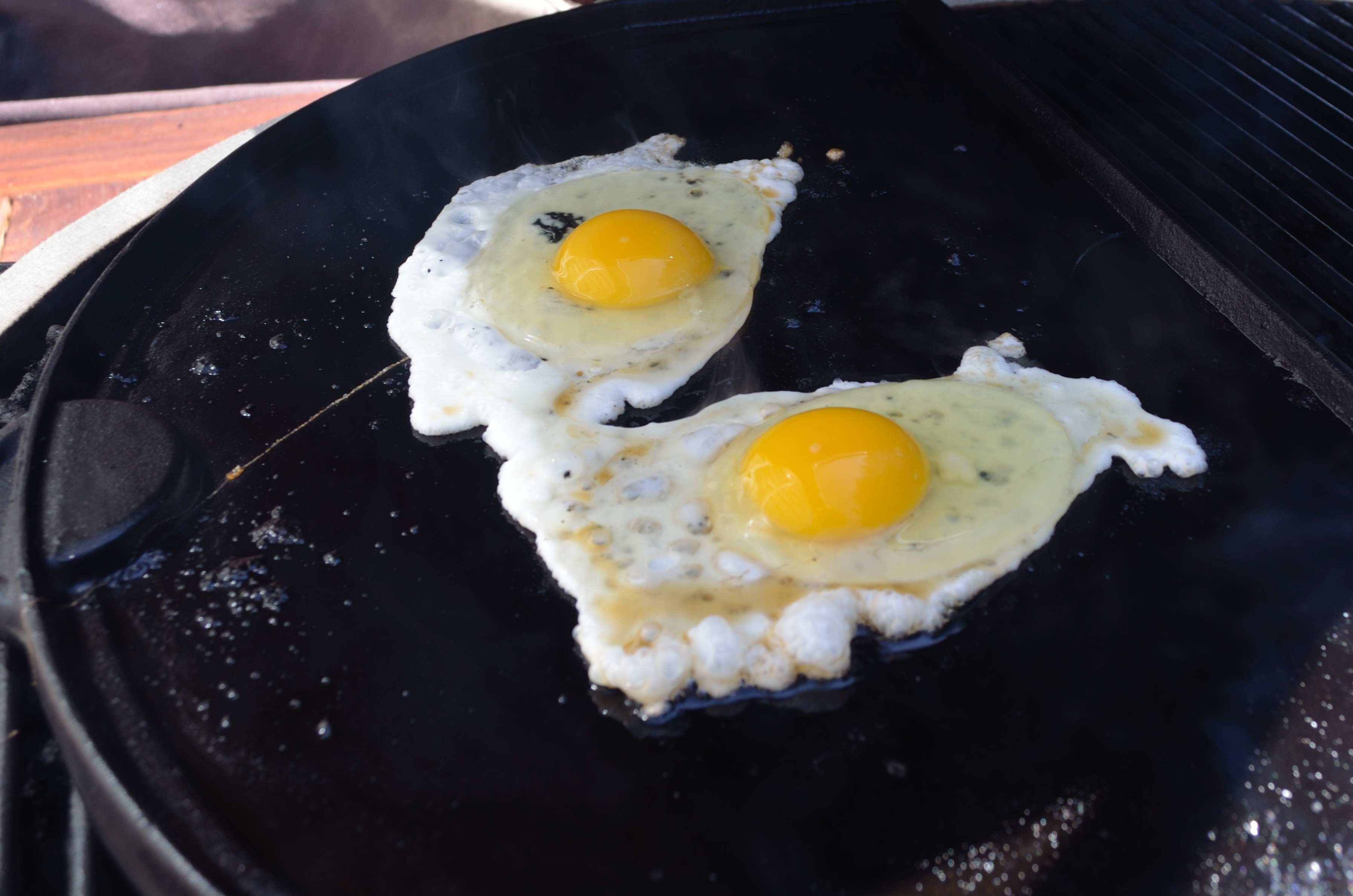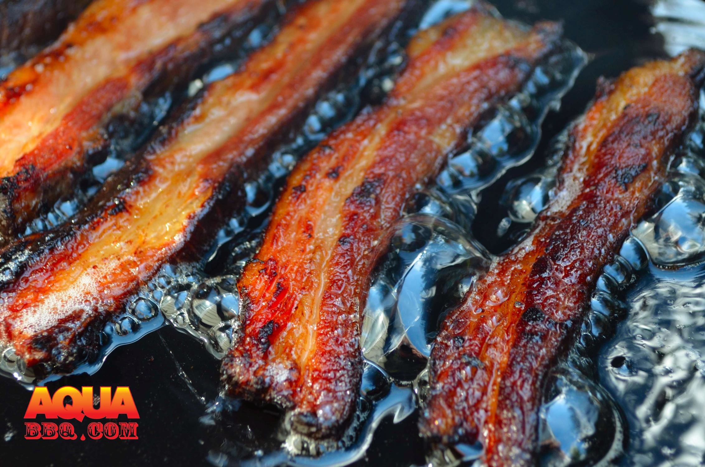 Here are the thick cut edge pieces of bacon frying on the same grill it was smoked on a few minutes before- a great example of the Primo’s versatility.