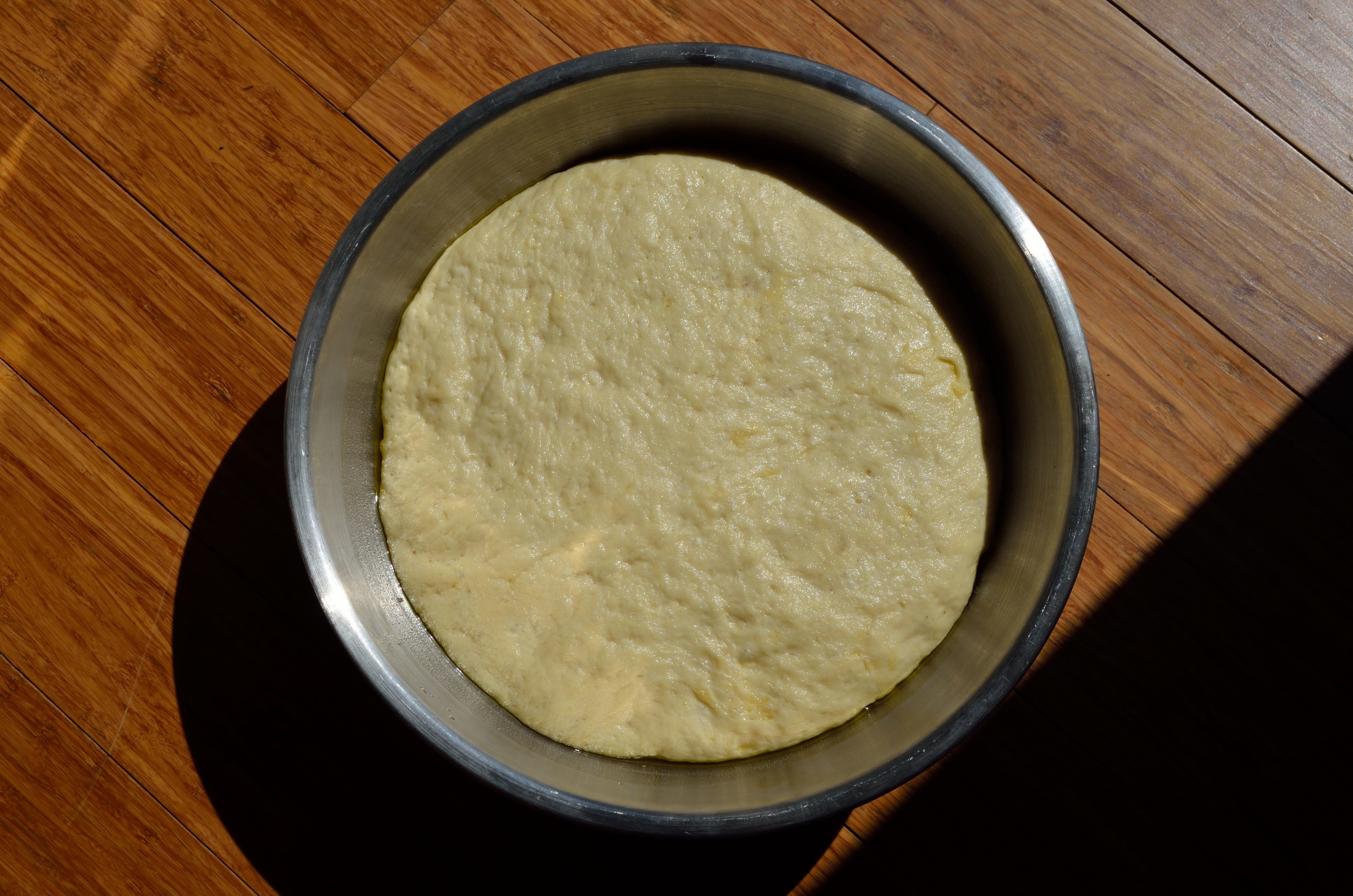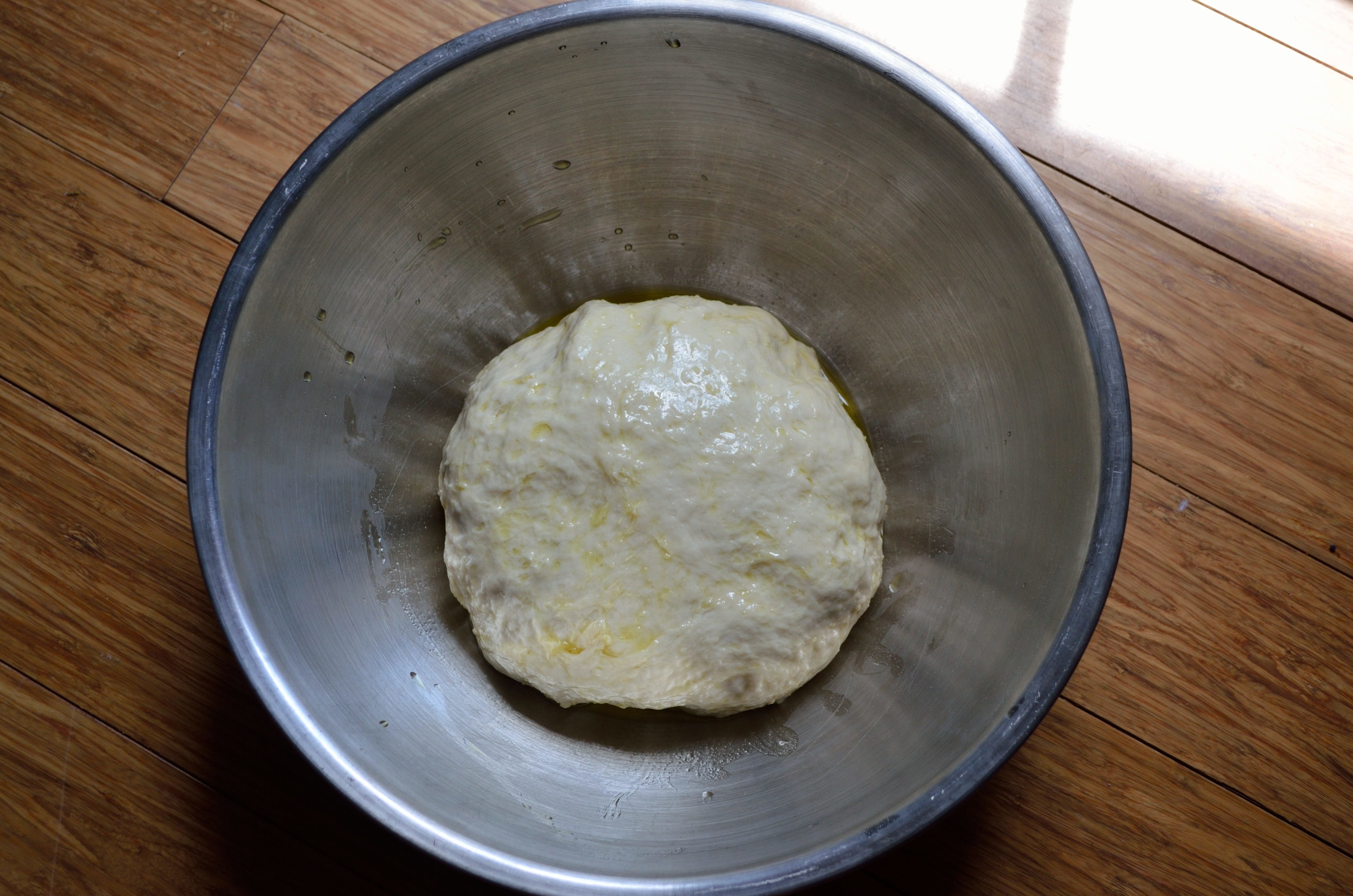Shape into a ball and put into a bowl greased with the olive oil- coat all sides of the ball, cover, and let it rest in a warm place for about an hour.