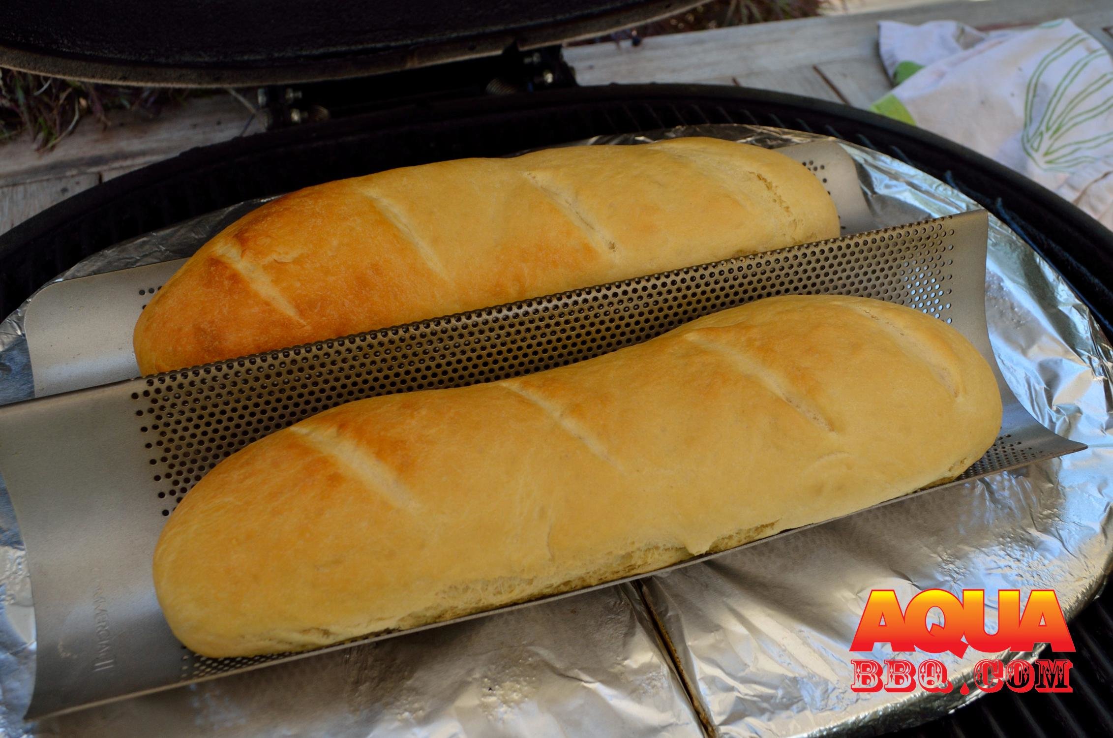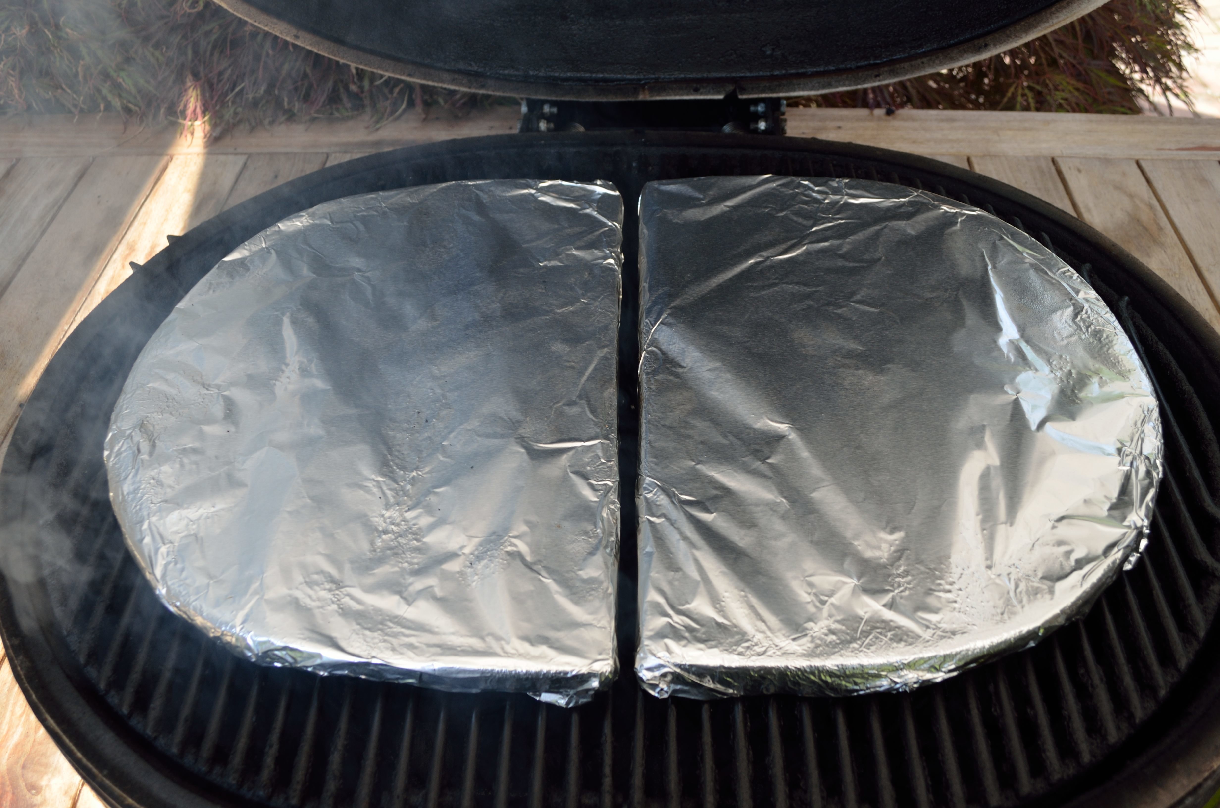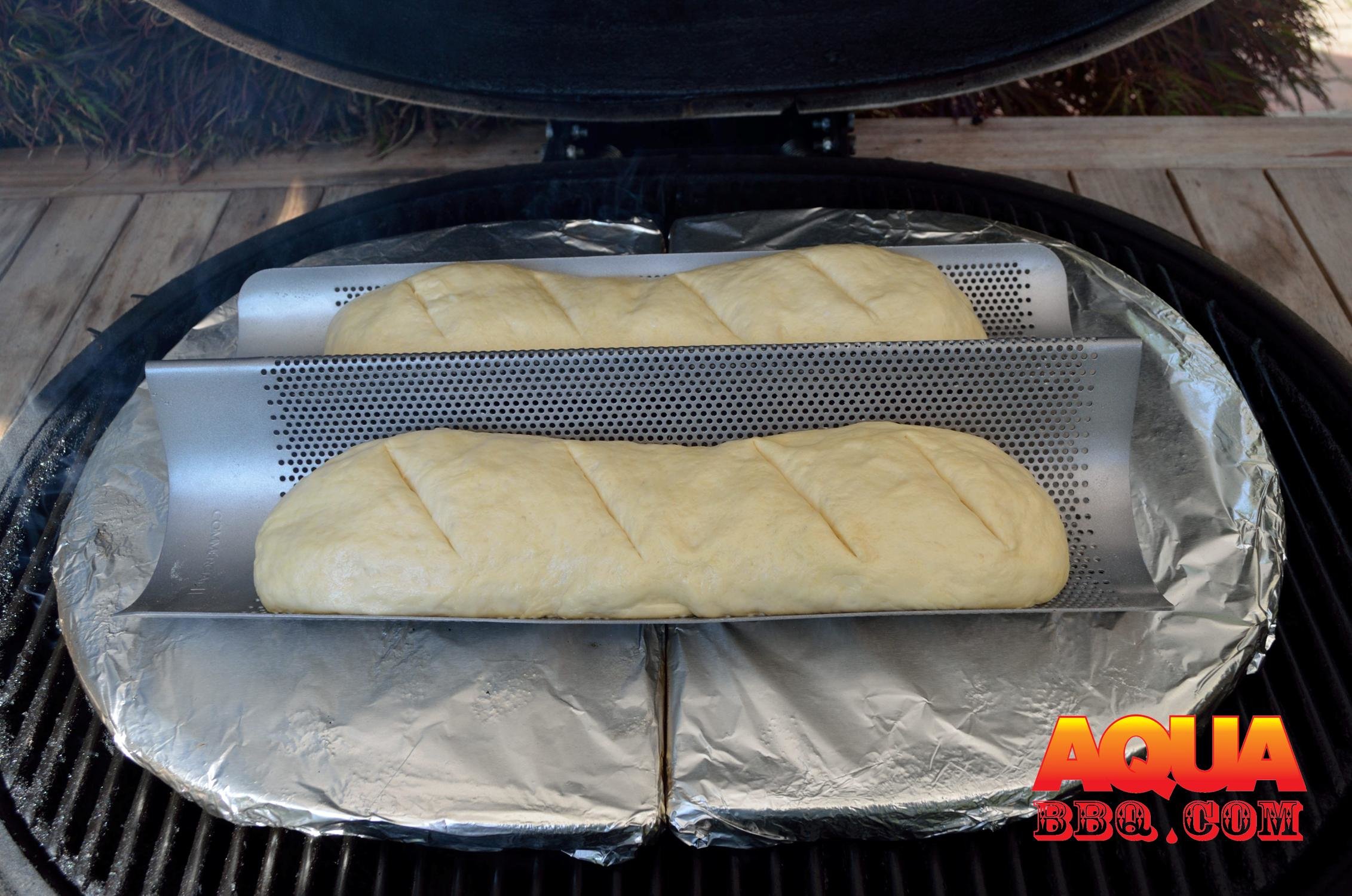 At this point prepare the Primo. We’ve used the Primo pizza stones in the past and they work well for round breads, bigger single loaves, and of course pizza. Here we opted to use the ceramic d plates wrapped in foil as cooking stones on top of the grill grates since we were looking to make longer loaves of bread. Target a grill temp of 350 or so- let it stabilize for 15 – 20 minutes so the ceramic lid is sufficiently warm. The radiant heat from the ceramic lid is key to an even bake.