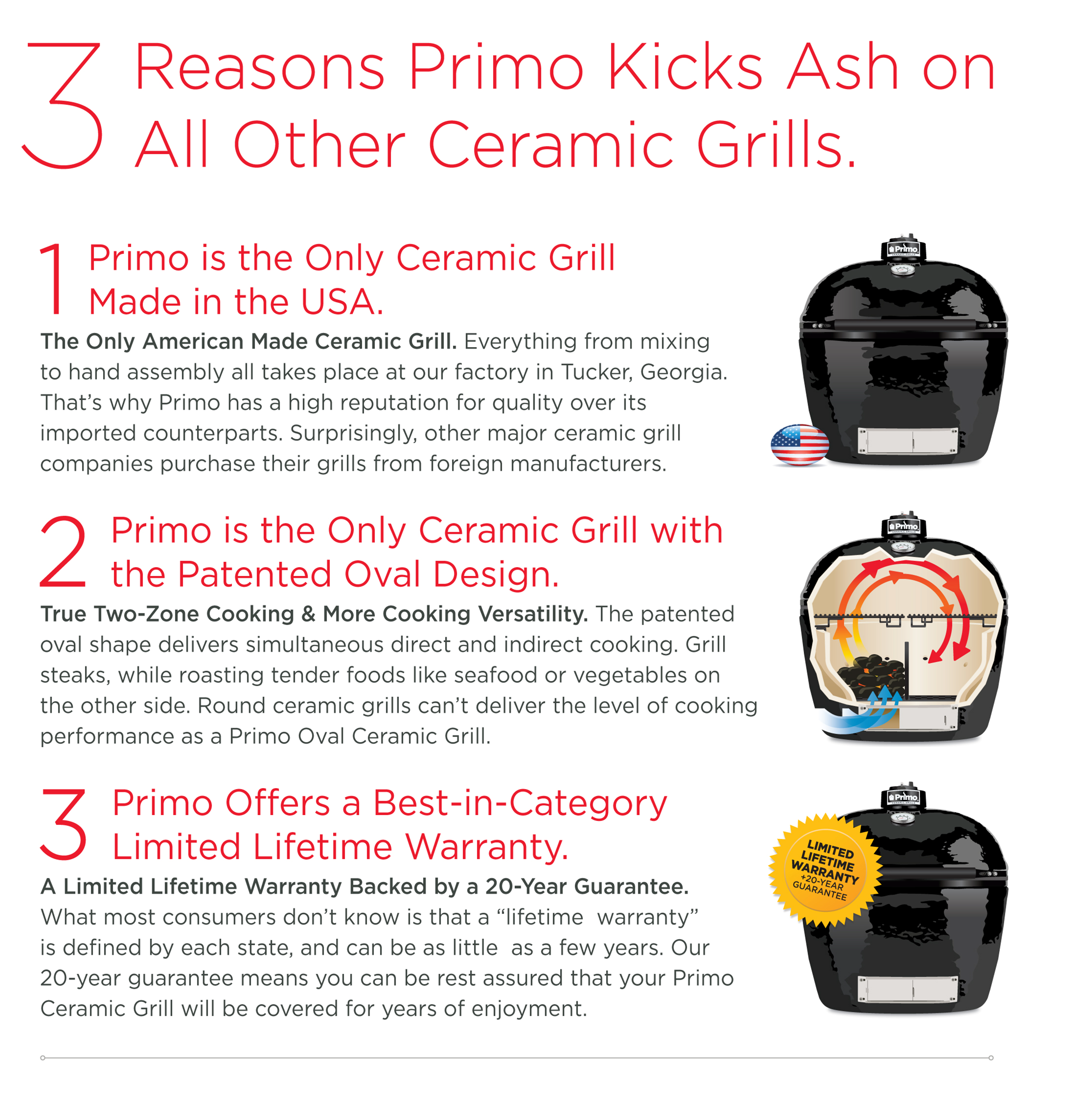 Perhaps the best review and compelling reason why the Primo is the superior choice vs any round grill, including the Big Green Egg, comes from amazingribs.com. This website is an endless resource of BBQ information including grill & product reviews and the science behind cooking amazing BBQ. The review, written by “the BBQ Whisperer” Meathead Goldwyn, speaks to the virtues of ceramic, egg, & kamado style cookers then talks more specifically about the “advantages of the oval shaped kamado and the problems of round kamados.” It is here that the review sings the praises of Primo’s oval shape and two zone ability vs the Big Green Egg’s round shape.