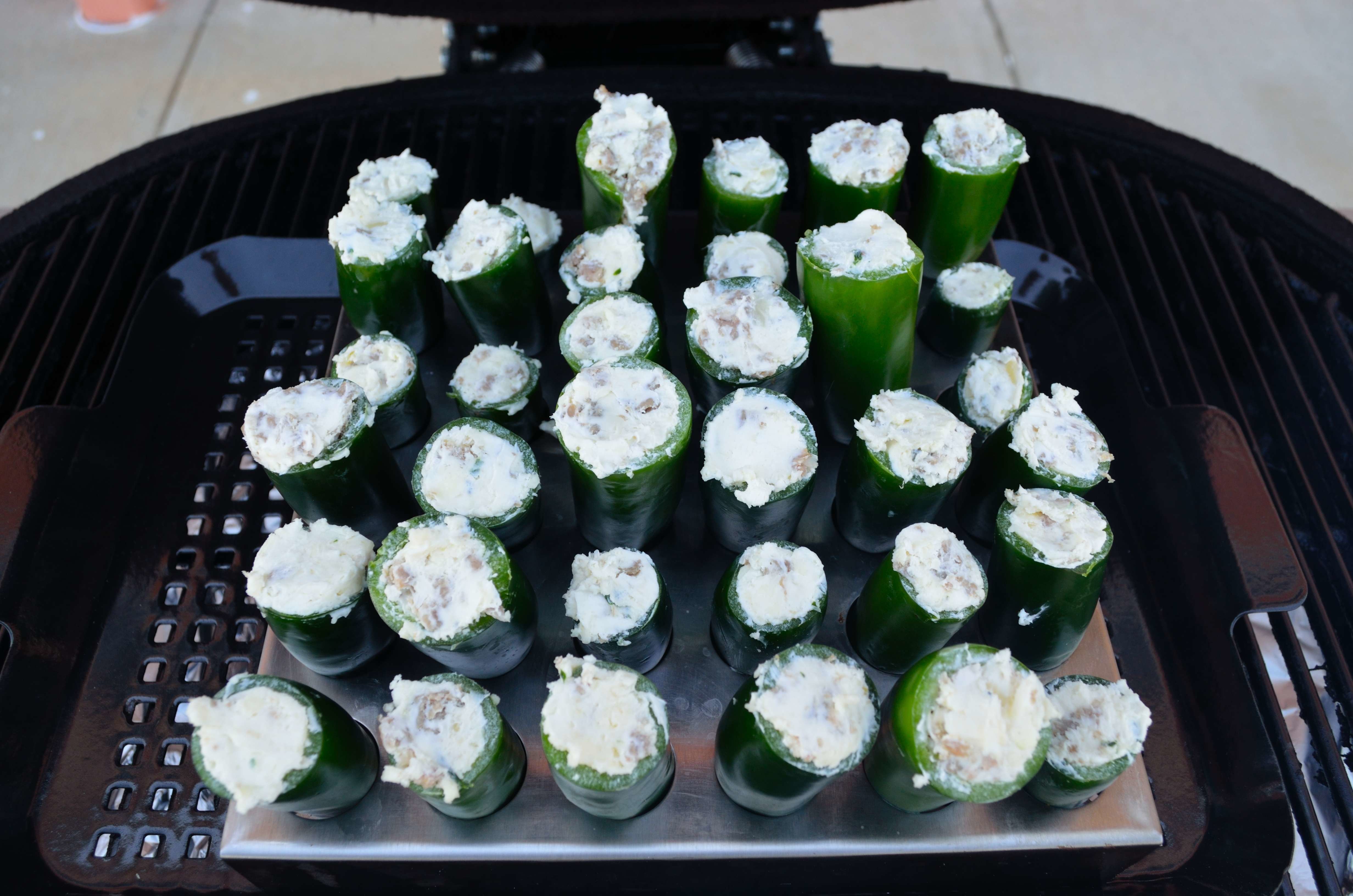 To make the filling, mix the cream cheese, the cheddar cheese, the cooked sausage/onions, and the chives. Next, prepare the jalapenos by removing the stems and cores and giving them a wash. Drain any water after washing by letting them rest upside down in the jalapeno rack. At this point prepare the Primo- you’ll want to target around 300 degrees with the d plates in.