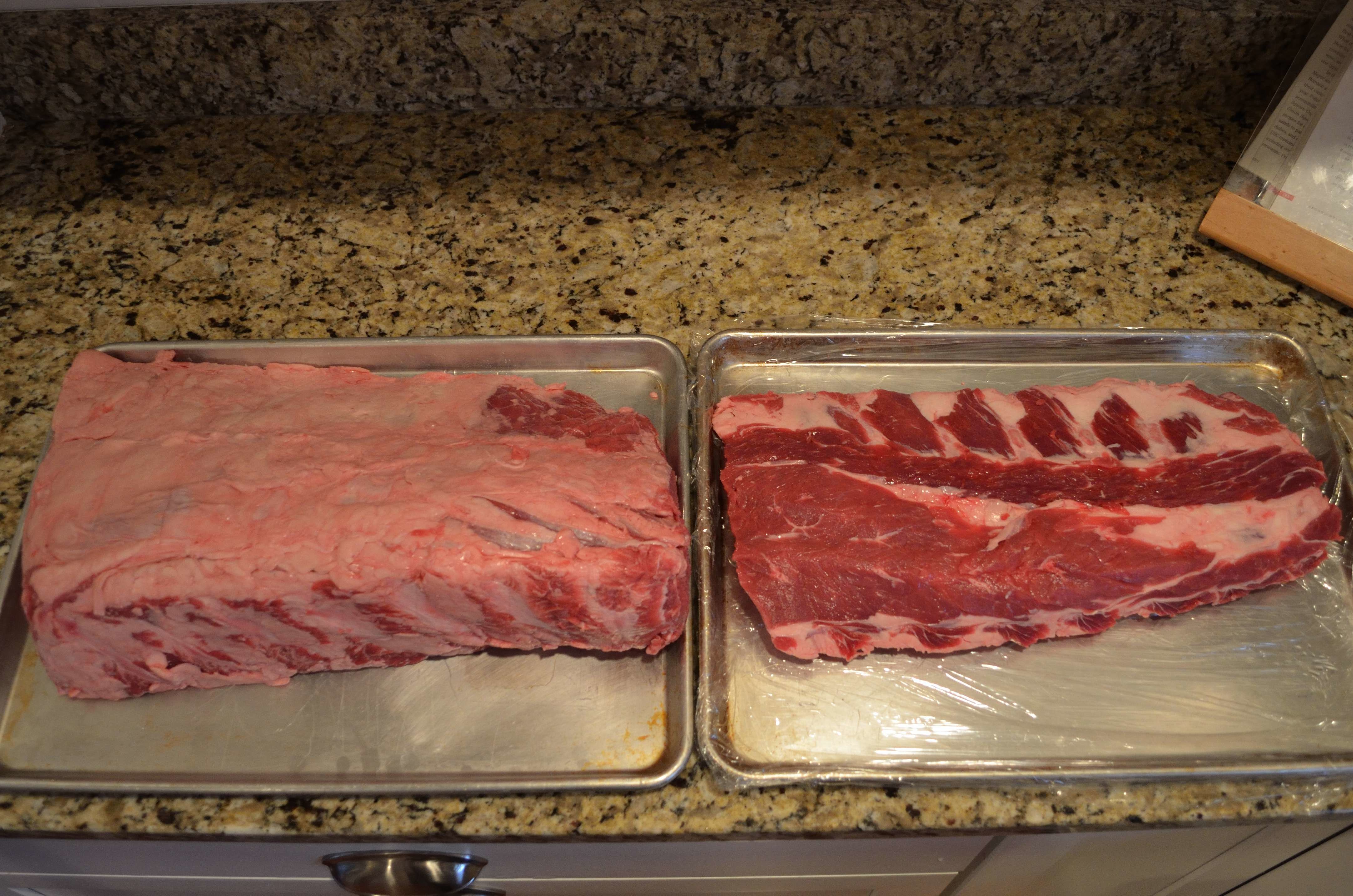Start with any size or grade of Prime Rib Roast. We recommend trimming off most of the fat to encourage the crust forming on meat, not fat. Separate the ribs from the roast. Salt generously and let it rest overnight in the fridge.