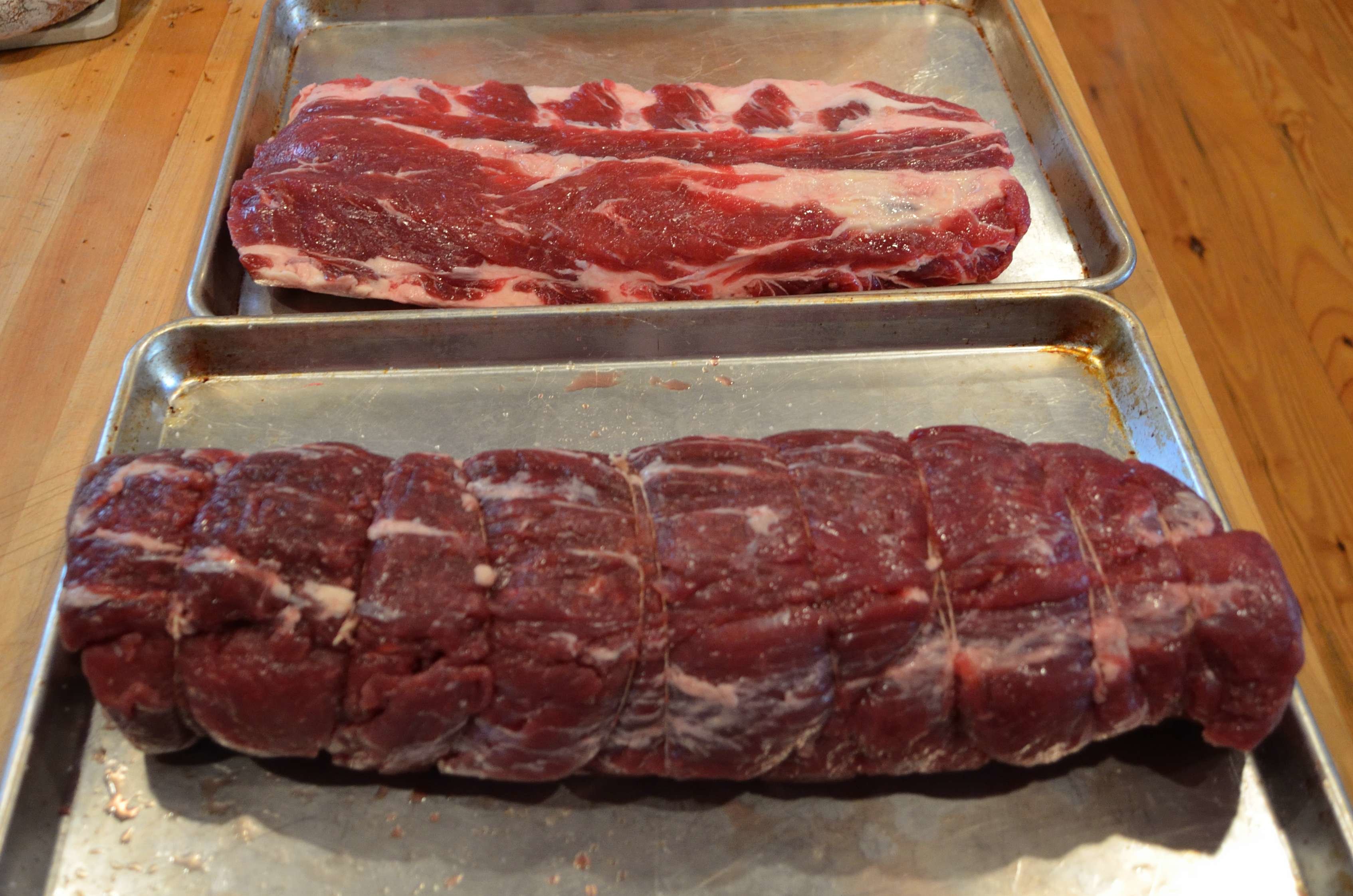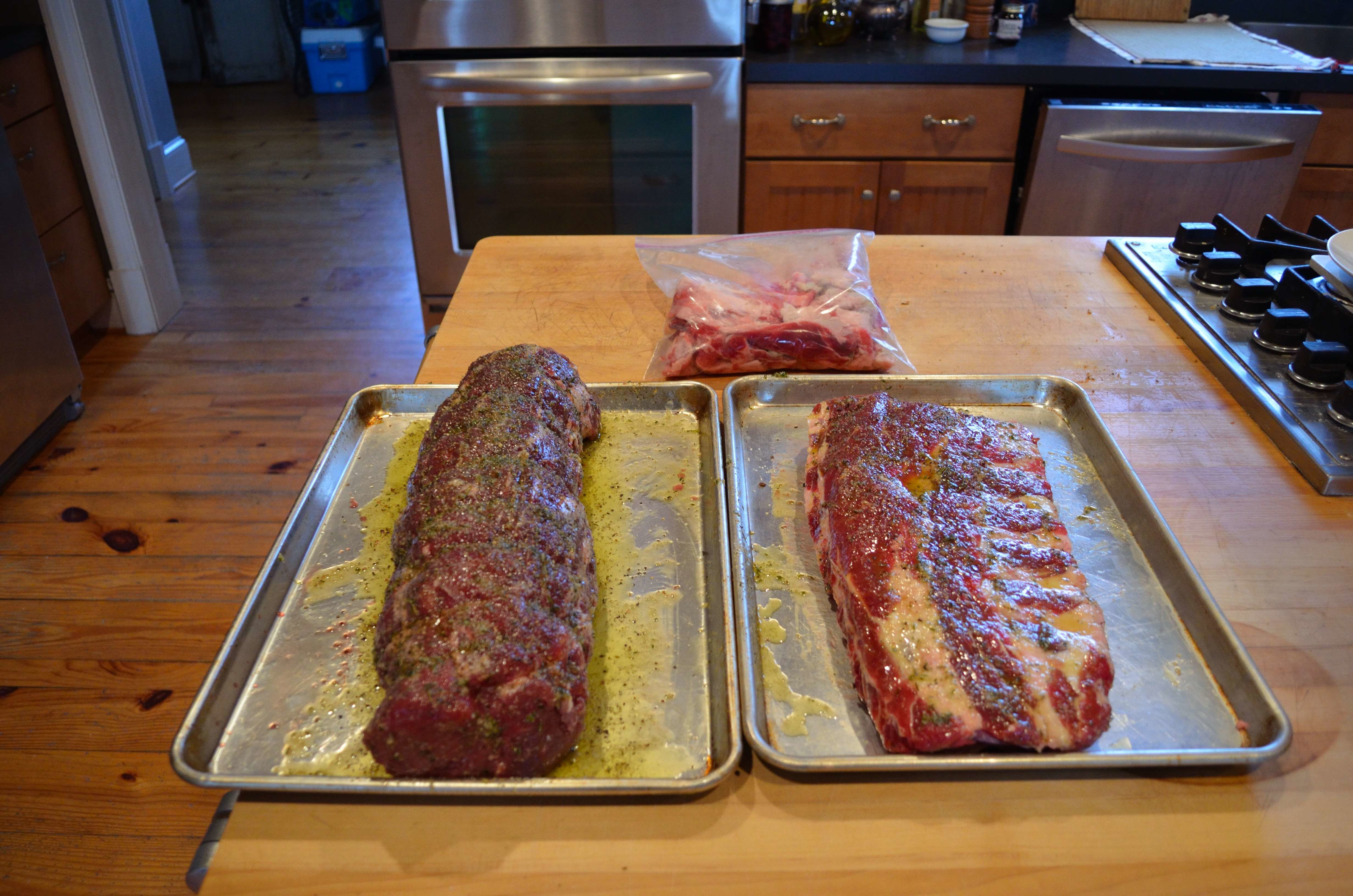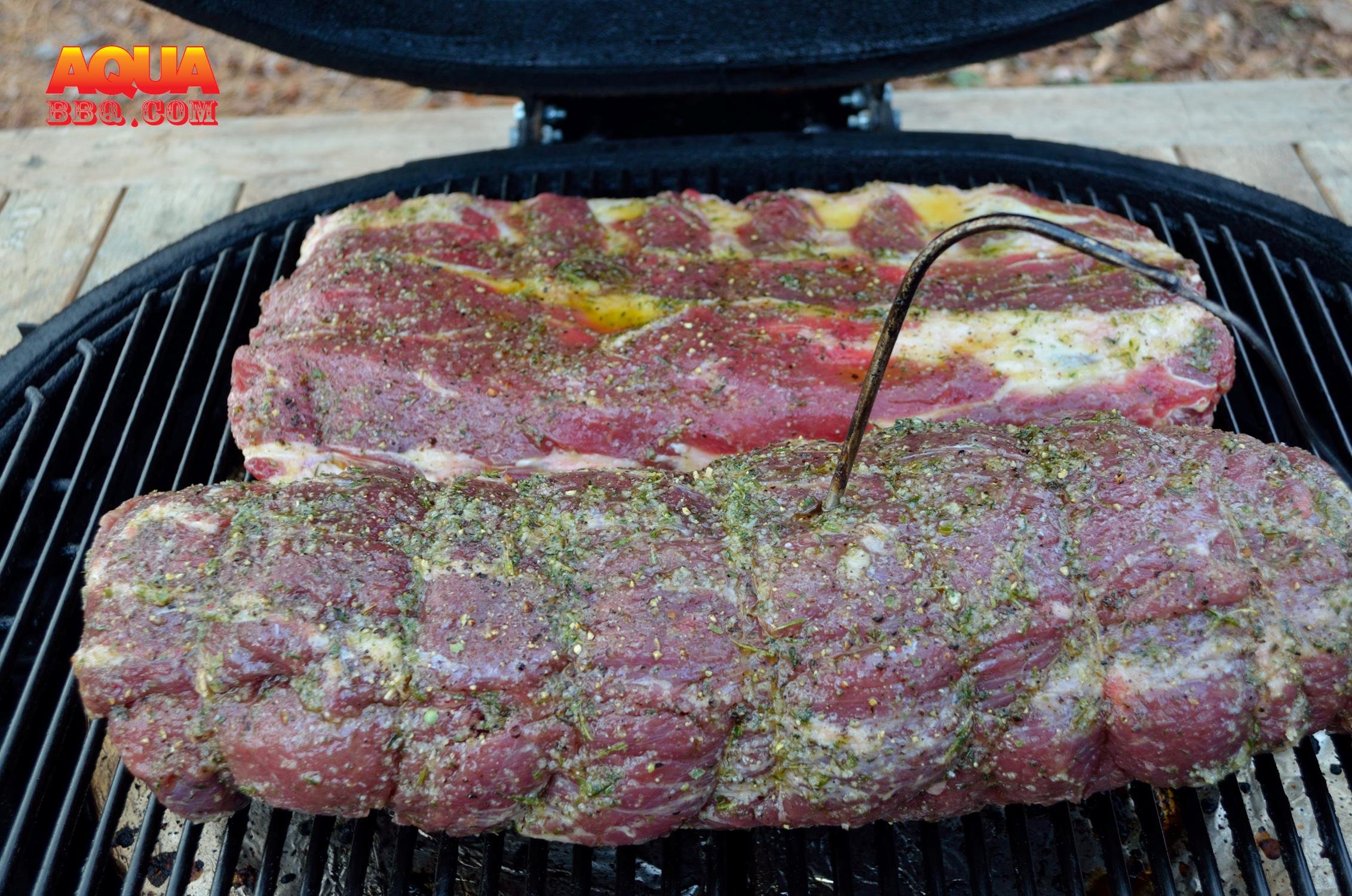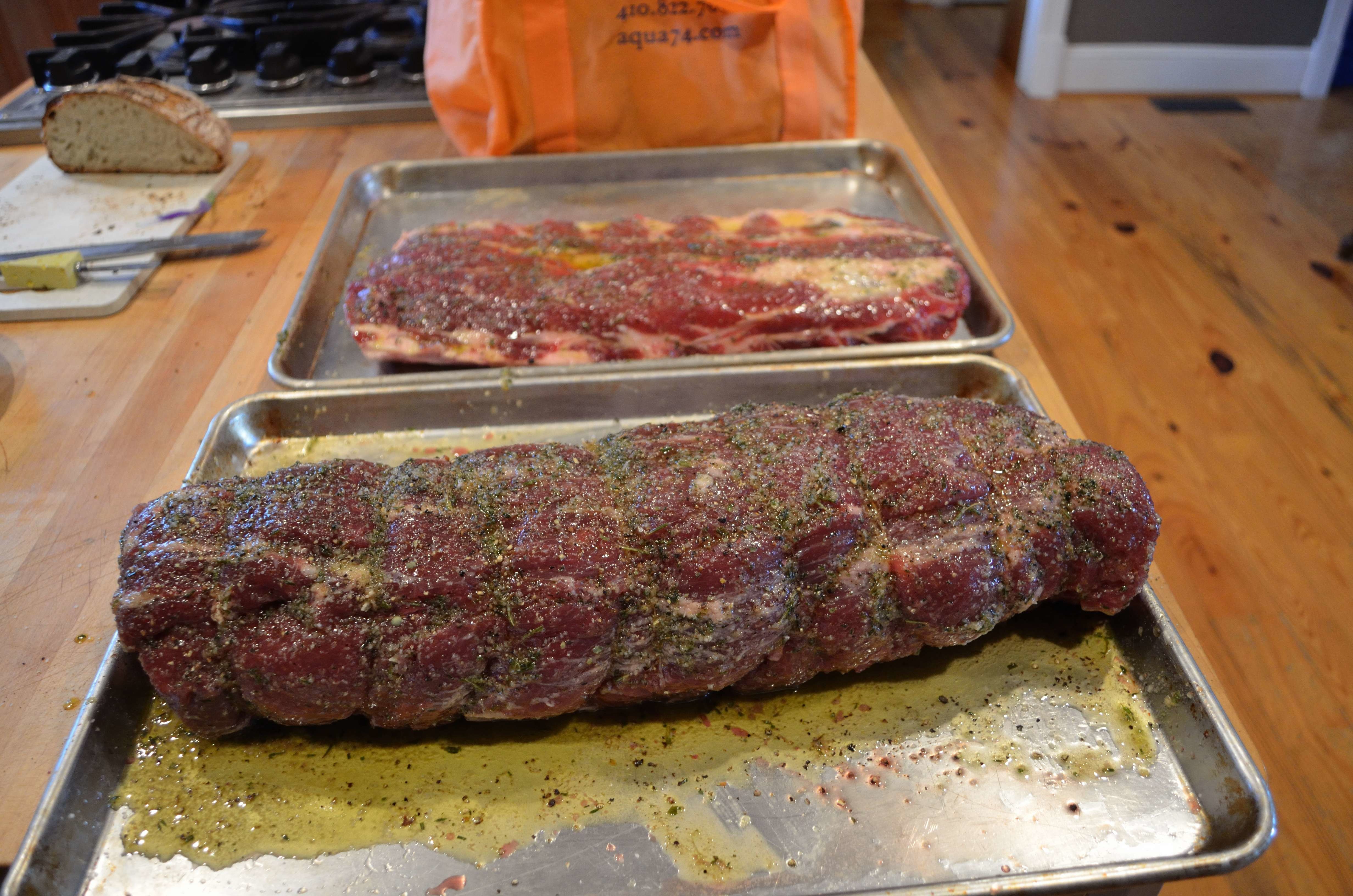 Prepare the Primo to 225 with the ceramic plates in. If you like you can add small amount of smoking wood- we used a single chunk of hickory wood. Coat the roast (and the ribs) with some flavor to help form a crust. We blended 1/3 cup of olive oil with 6 cloves of garlic, 2 tablespoons fresh rosemary, 1 tablespoon fresh thyme, and about a teaspoon each of kosher salt and crushed pepper. After you brush on the oil mixture, give a final light coat of kosher salt and crushed pepper. We cooked the trimmings in a foil pan with some of the oil mixture and small amount of water- you’ll end up with a few bites of high end pot roast. Alternatively you could use the trimming to make an au jus. You could also opt to leave 1/2 of the grill exposed to direct heat without the ceramic plate in. This will allow you to finish the roast’s last 10 degrees over direct heat for more crust. You could also remove the 2nd plate at the end of the cook.