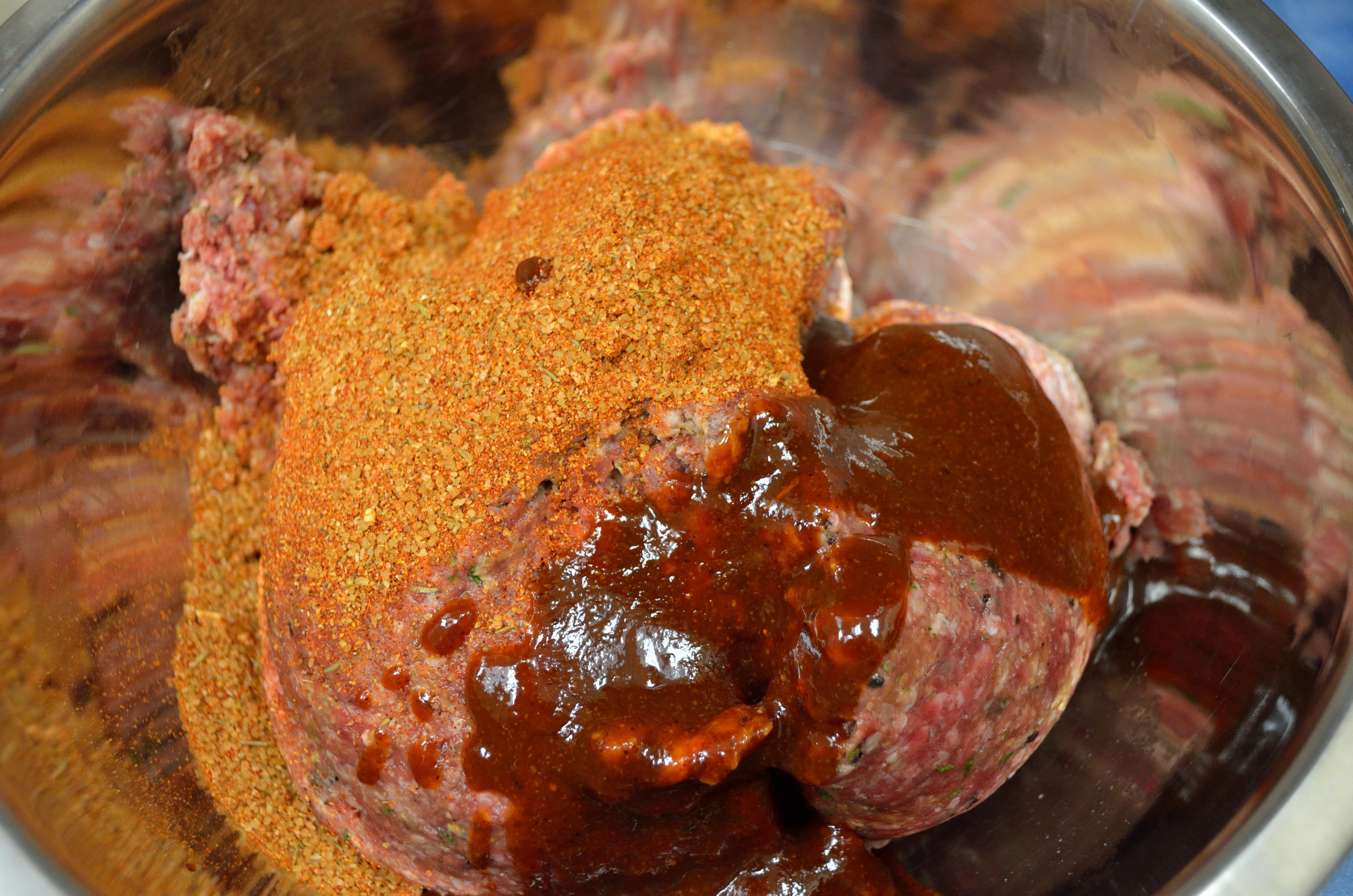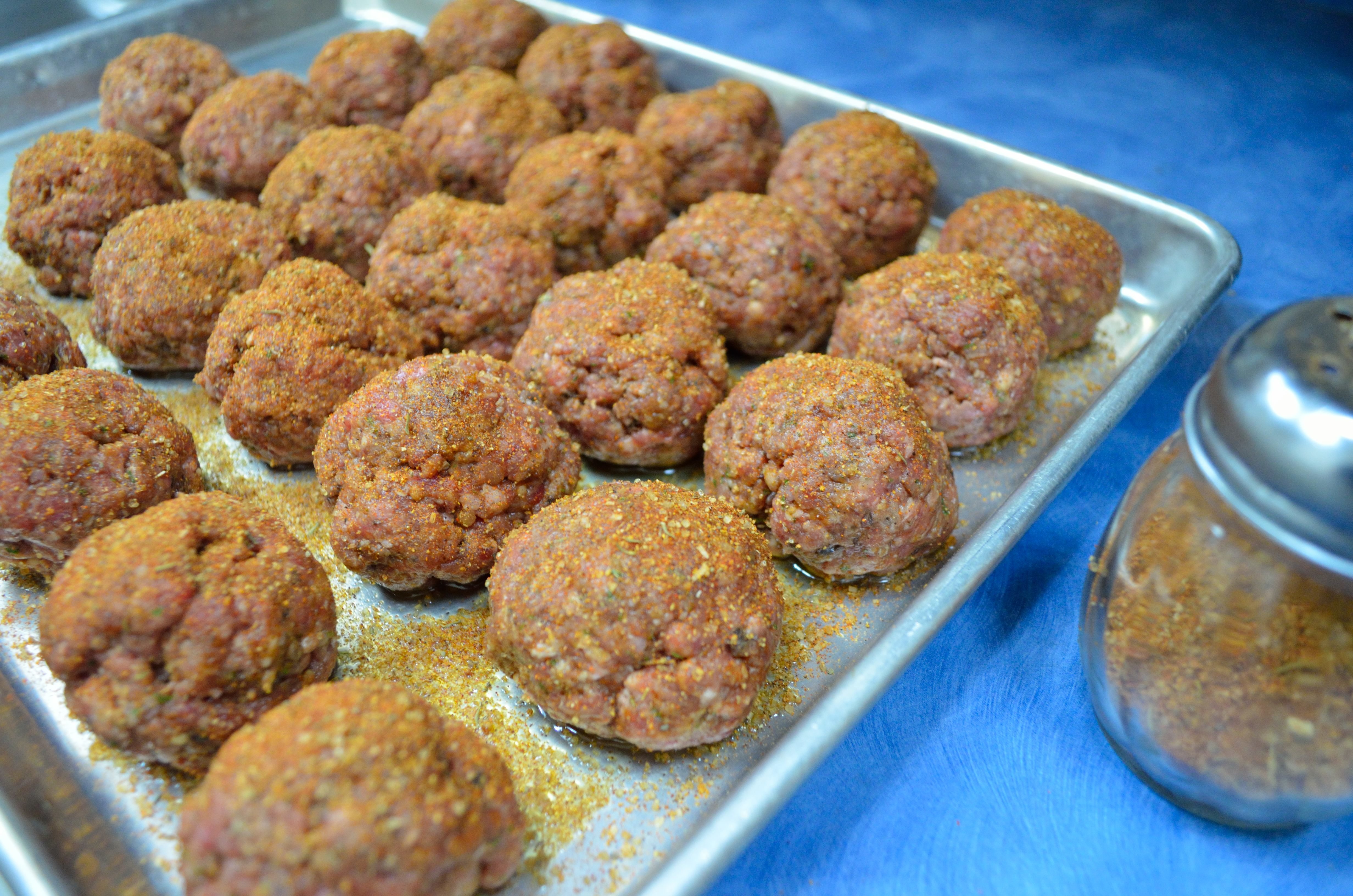 Start with your favorite meatball recipe – just hold back whatever salt is recommended. Add a tablespoon of your favorite BBQ rub and two tablespoons of your favorite BBQ sauce per pound of meat. We used 4lbs here.