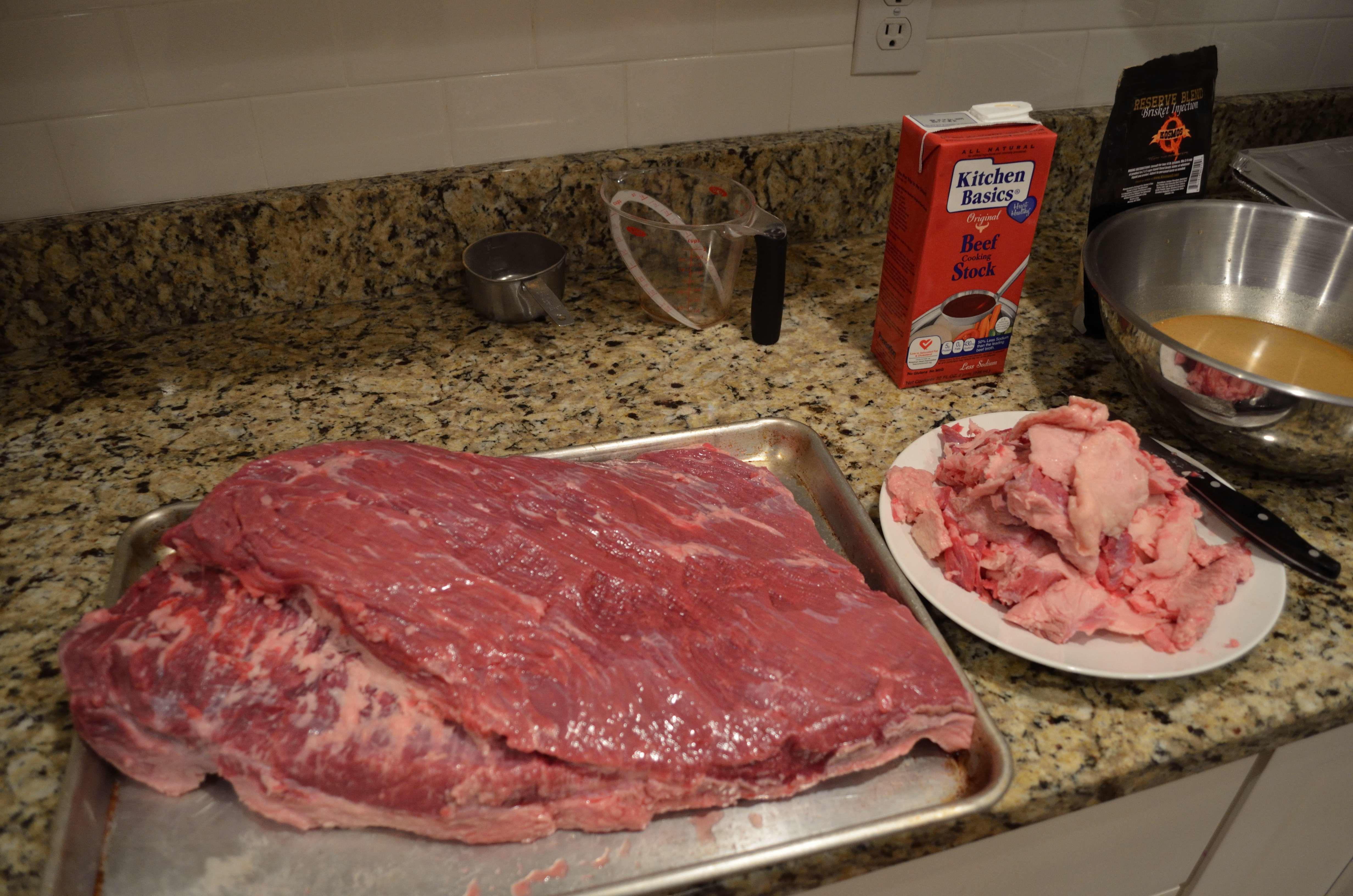 The first step is to trim the brisket- remove any silver skin and excess fat from the top and trim the fat cap underneath. You can see the pile that was trimmed. Next, you can brine or inject the brisket. If you brine it, you can do so for up to 48 hours. For this brisket, we injected it with Kosmos Q Reserve Blend Brisket injection mixed with beef stock. After injecting, let the brisket rest for 1 to 8 hours.