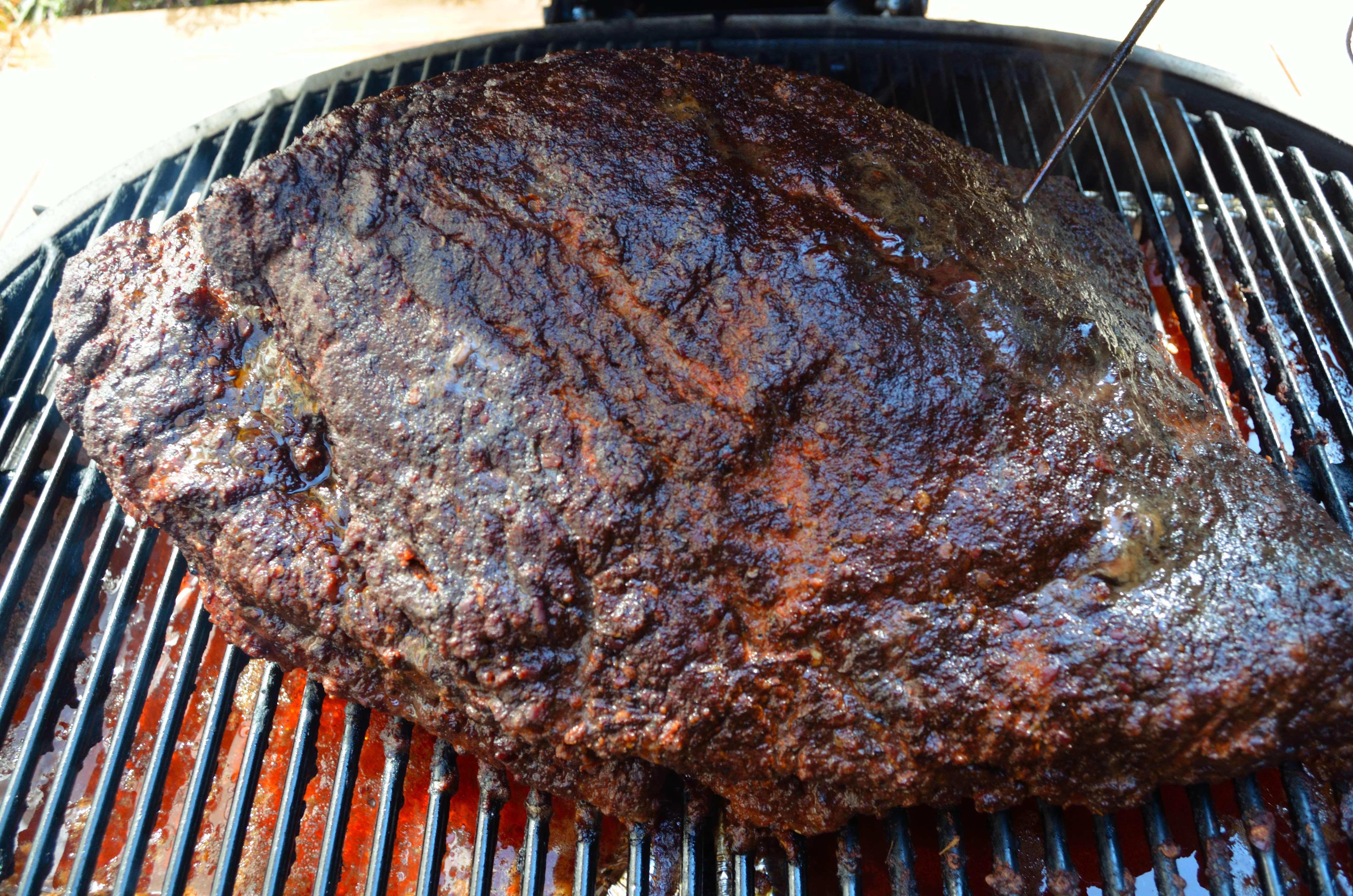 Smoke until the internal temp hits 160 or so in the flat. This may take 4-6 hours. A thermapen is a helpful tool here.