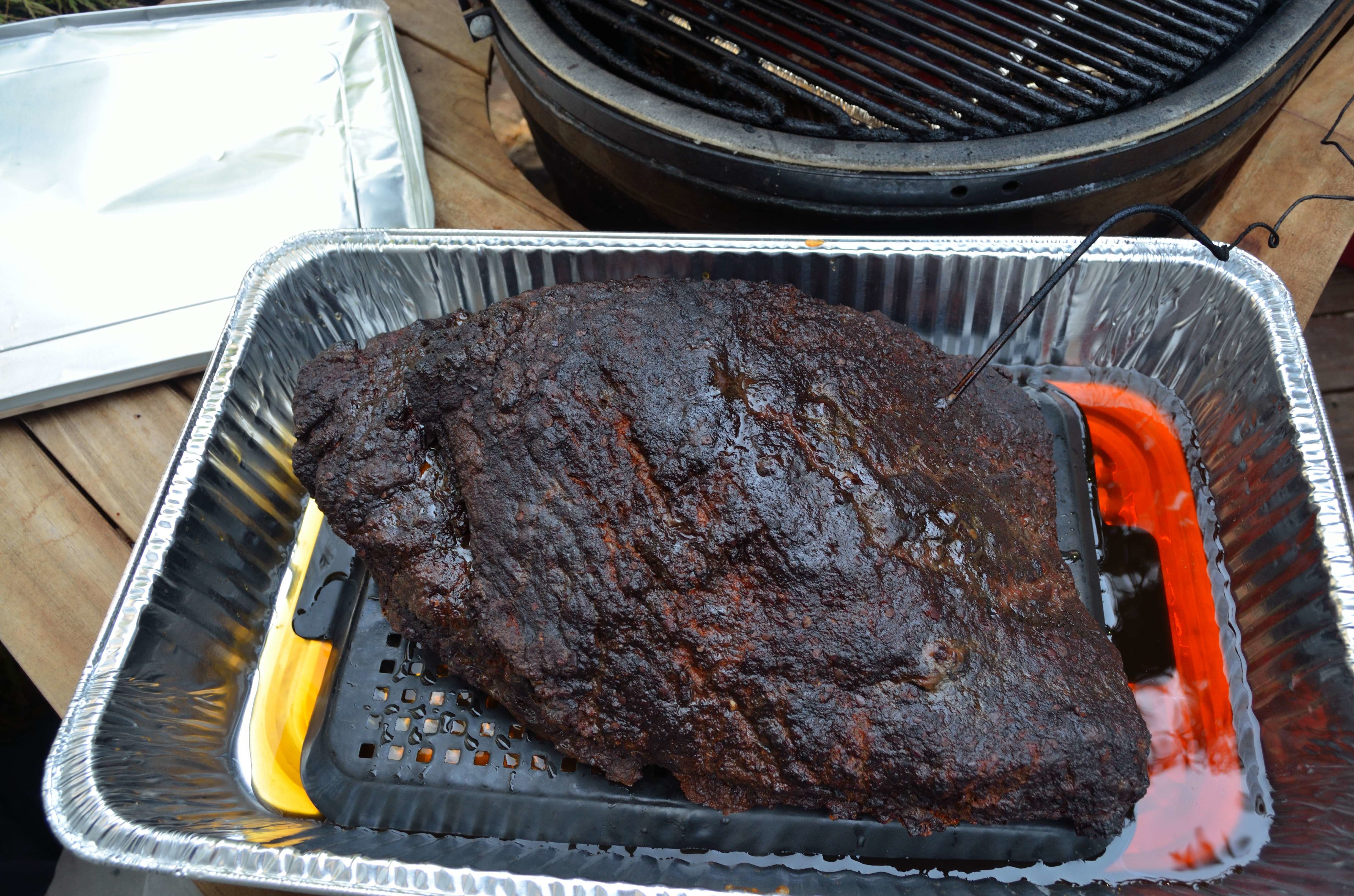 At this point you can choose to wrap the brisket in foil with some stock or even let it go on the grill. However, we would recommend putting the brisket in a pan with some stock, taking care to elevate the brisket above the liquid. Cover the pan with foil and continue cooking until the flat is 195 to 200. Once it reaches temp let it rest for a moment and then wrap it first in foil, then a towel, and then let it rest in a cooler for 1 to 3 hours. Reserve the pan stock and drippings if desired for serving.