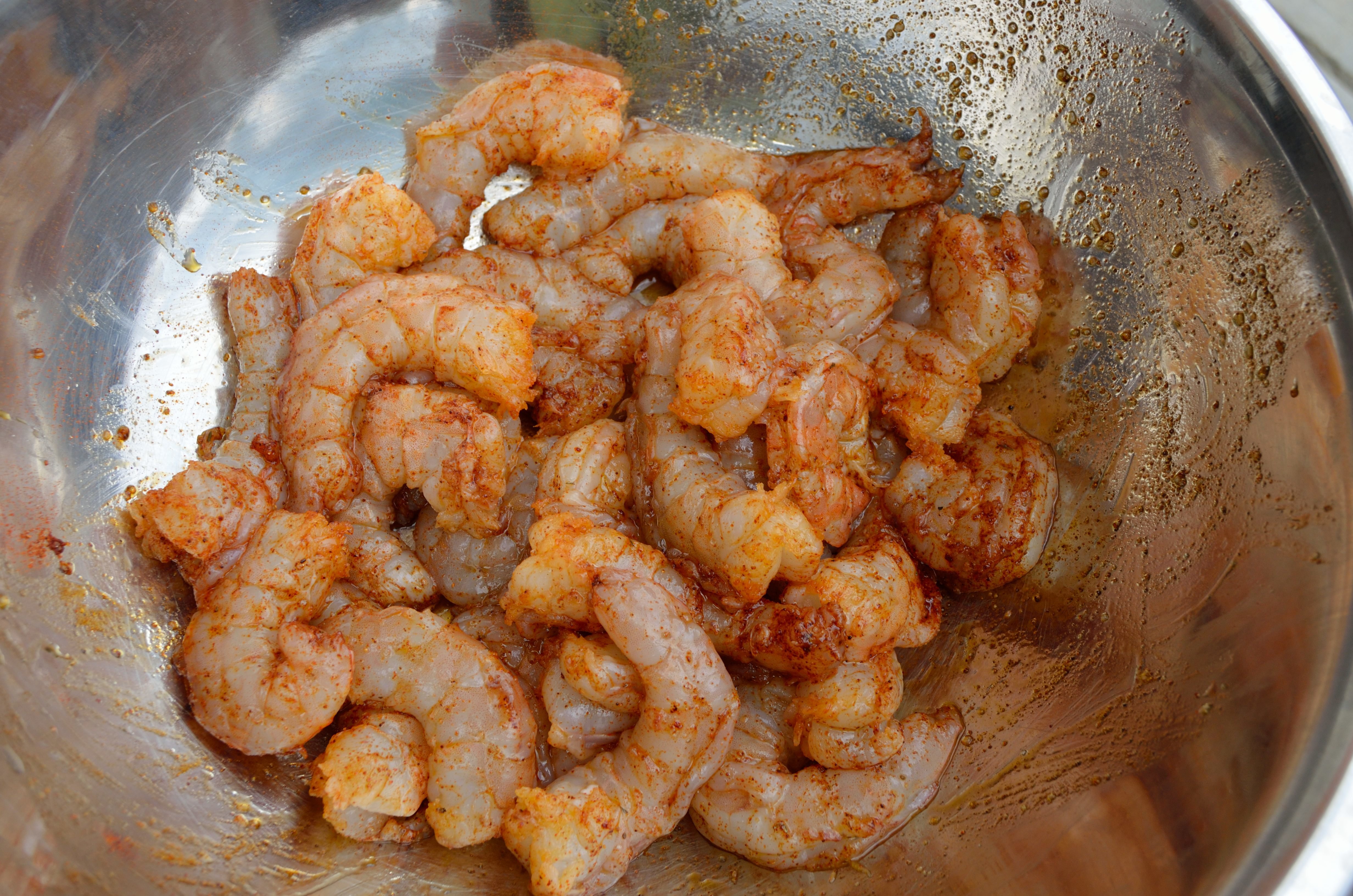 We used 2lbs of wild-caught USA jumbo shrimp that we peeled and deveined. Coat with olive oil and your favorite rub, about 1/4 cup each, and let it all rest in the fridge.