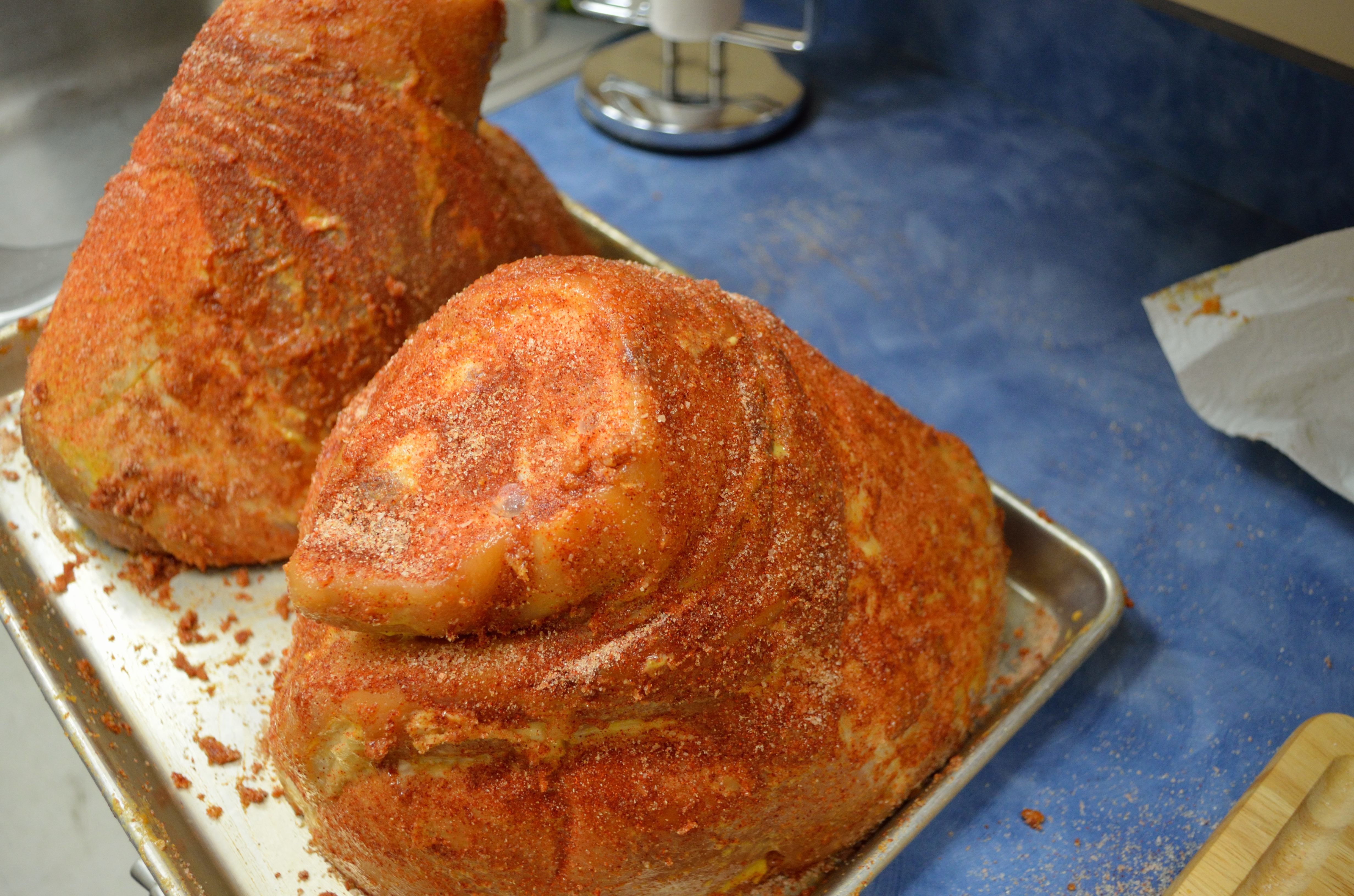 Start by coating the ham with a touch of honey mustard and then a light dusting of rub. For the rub, we mixed: